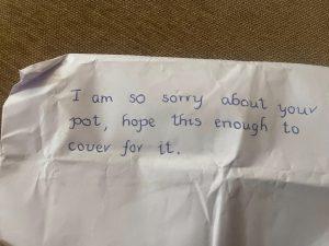 അജ്ഞാതനായ ആ വ്യക്തി അവിടെ വച്ചിട്ടു പോയത്. ഒരു ചെടിച്ചട്ടി പൊട്ടിയതിനപ്പുറം ഹൃദയത്തിൽ സത്യവും നന്മയും സ്നേഹവും സഹകരണവും ഉള്ളവരായതിനാലാവും അവരീ കുറിപ്പും പണവും വച്ച് പോയത്.